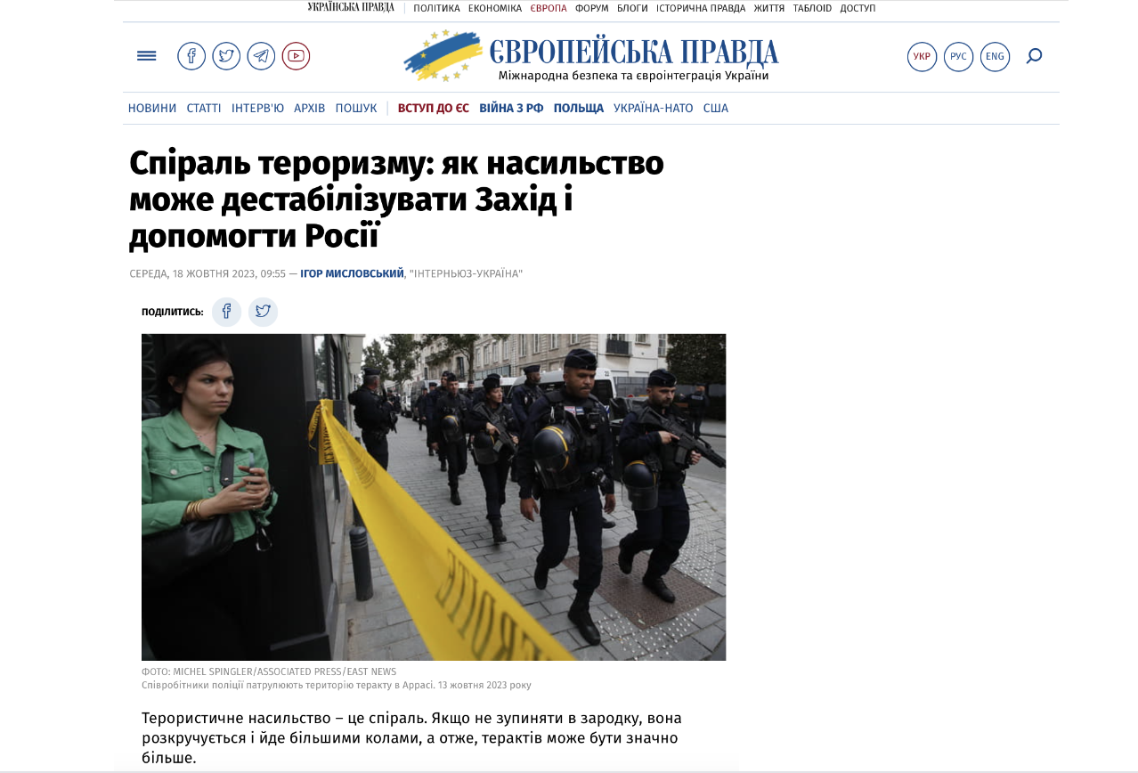 “The goal of terrorists is to intimidate society with their attacks, spread fear, and prompt panic through random killings, reaching a point where citizens demand concessions from the authorities in response to the perpetrators of violence,” Igor Myslovsky, an analyst at Internews Ukraine, discussing the impact of modern terrorism on Western democracies and the role of the media in spreading terrorist activity.