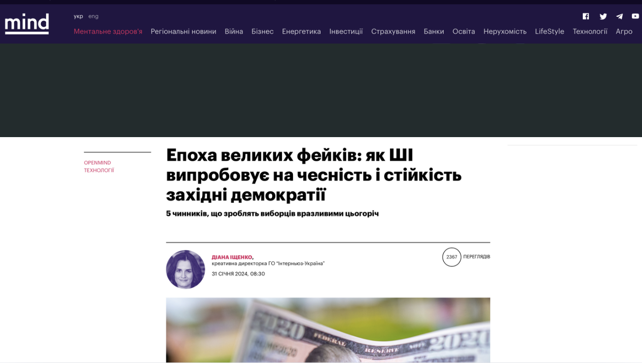 "Language models can create more convincing propaganda compared to that written by humans. At the same time, it is significantly harder to detect, as it is produced quickly and on a massive scale," Diana Ishchenko, Creative Director at Internews Ukraine, explained the impact of generative artificial intelligence on electoral processes, the risks of mass disinformation, and the challenges it poses to modern democracies.