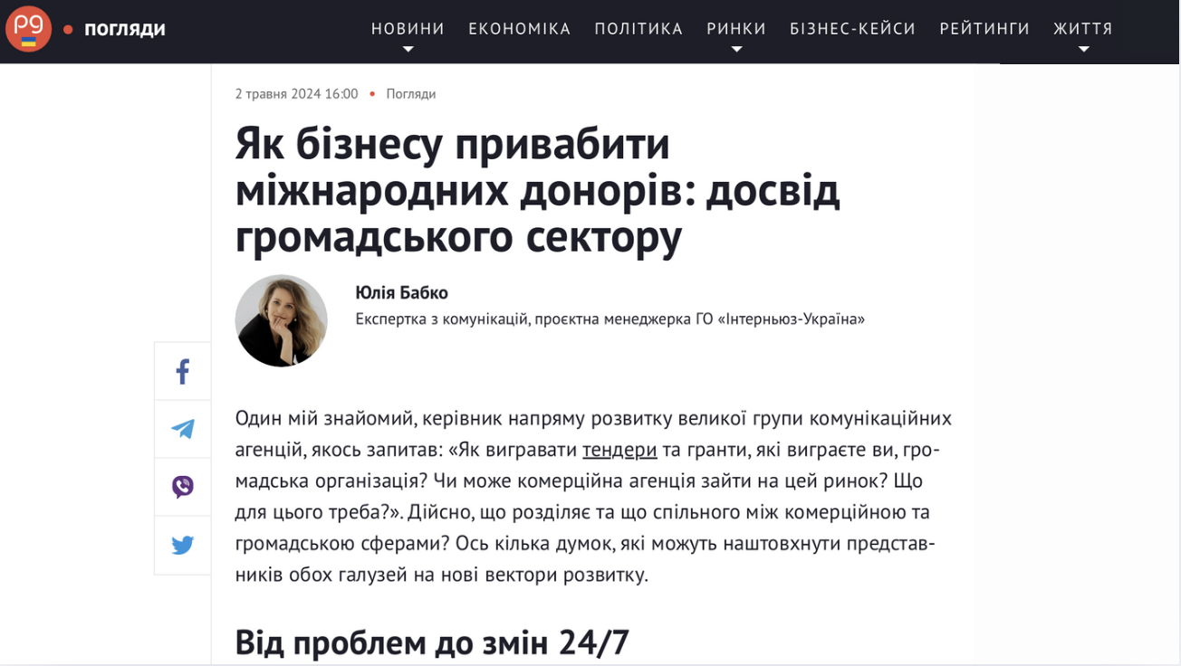 "A common approach is the collaboration between businesses and nonprofit organizations in a consortium, especially in IT or technology projects where unique expertise is required. This provides the best foundation for a win-win partnership," Yulia Babko, project manager at Internews Ukraine, discussed the key challenges businesses face in attracting international funding, and strategic partnerships that can become the foundation for innovative solutions and investment attraction.