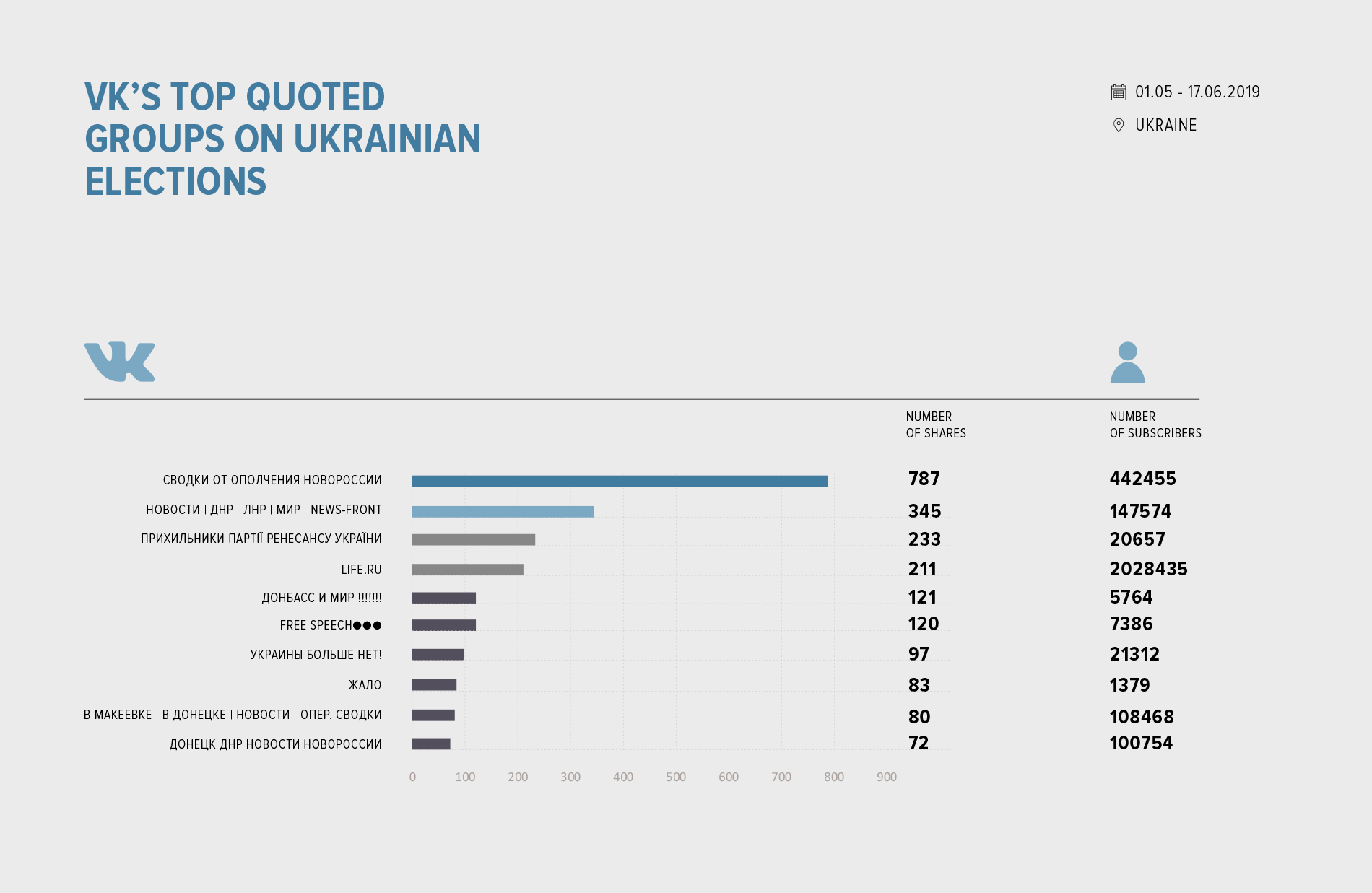 In our previous report, we have demonstrated that following the imposition of Ukrainian sanctions, VK became a zone of even more visible Russian propaganda. The present stage of our study confirms this conclusion. In the context of Ukrainian elections, the authors of the most popular posts include former members of the Party of Regions or openly pro-Russian political analysts. The most shared posts often come from popular groups that support Russia's actions in Ukraine and the self-proclaimed separatist republics.