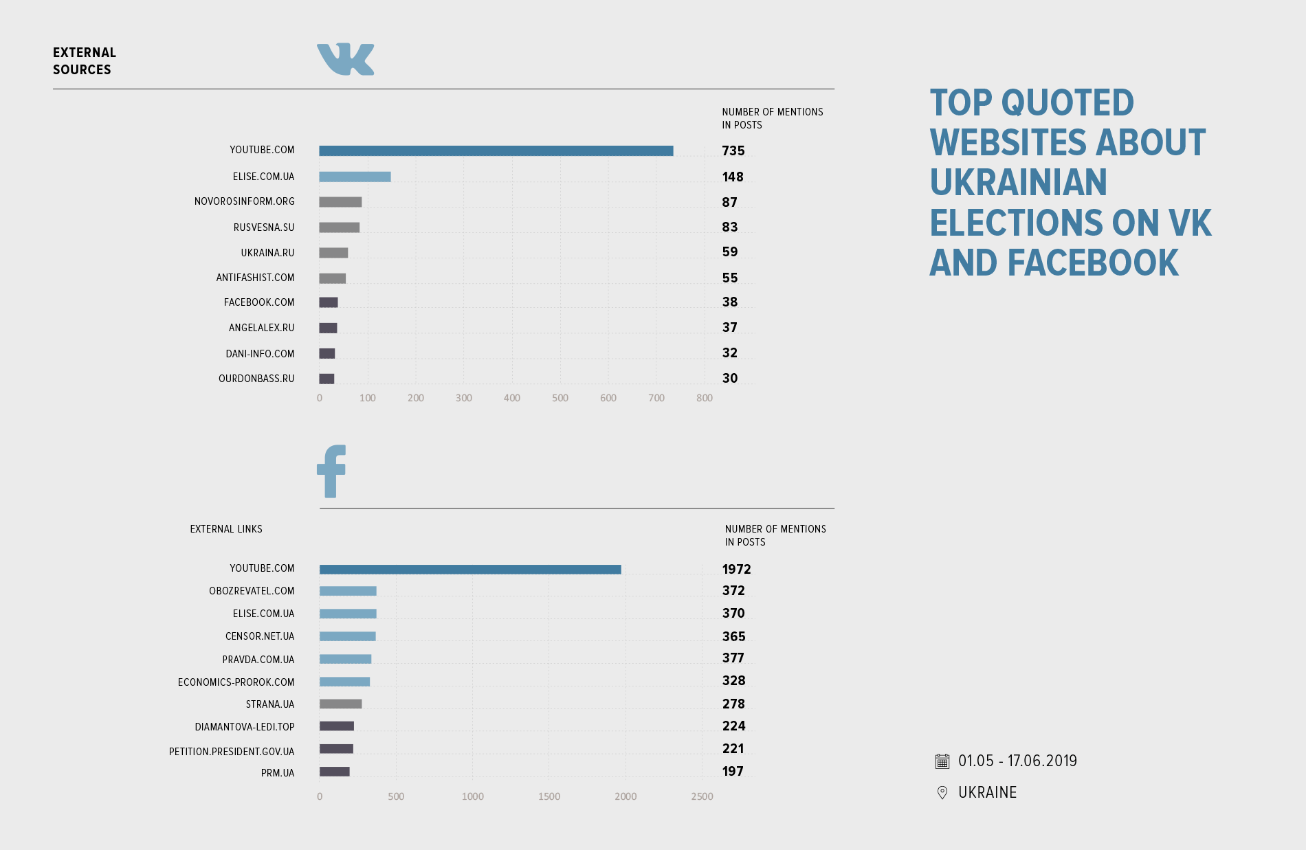 On July 17, 2019, NGO Internews Ukraine and data analytics company Singularex presented key findings of the research 'What Facebook, Instagram, VK users are saying about the parliamentary race'. Using neural networks and artificial intelligence approaches, data research analysts studied 5.6 mln posts from users who marked Ukraine as their country of residence for the period from May 1 to June 17, 2019.