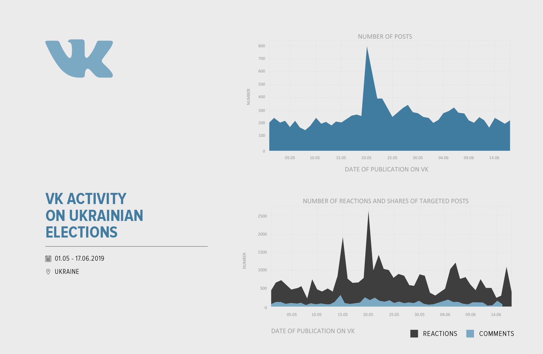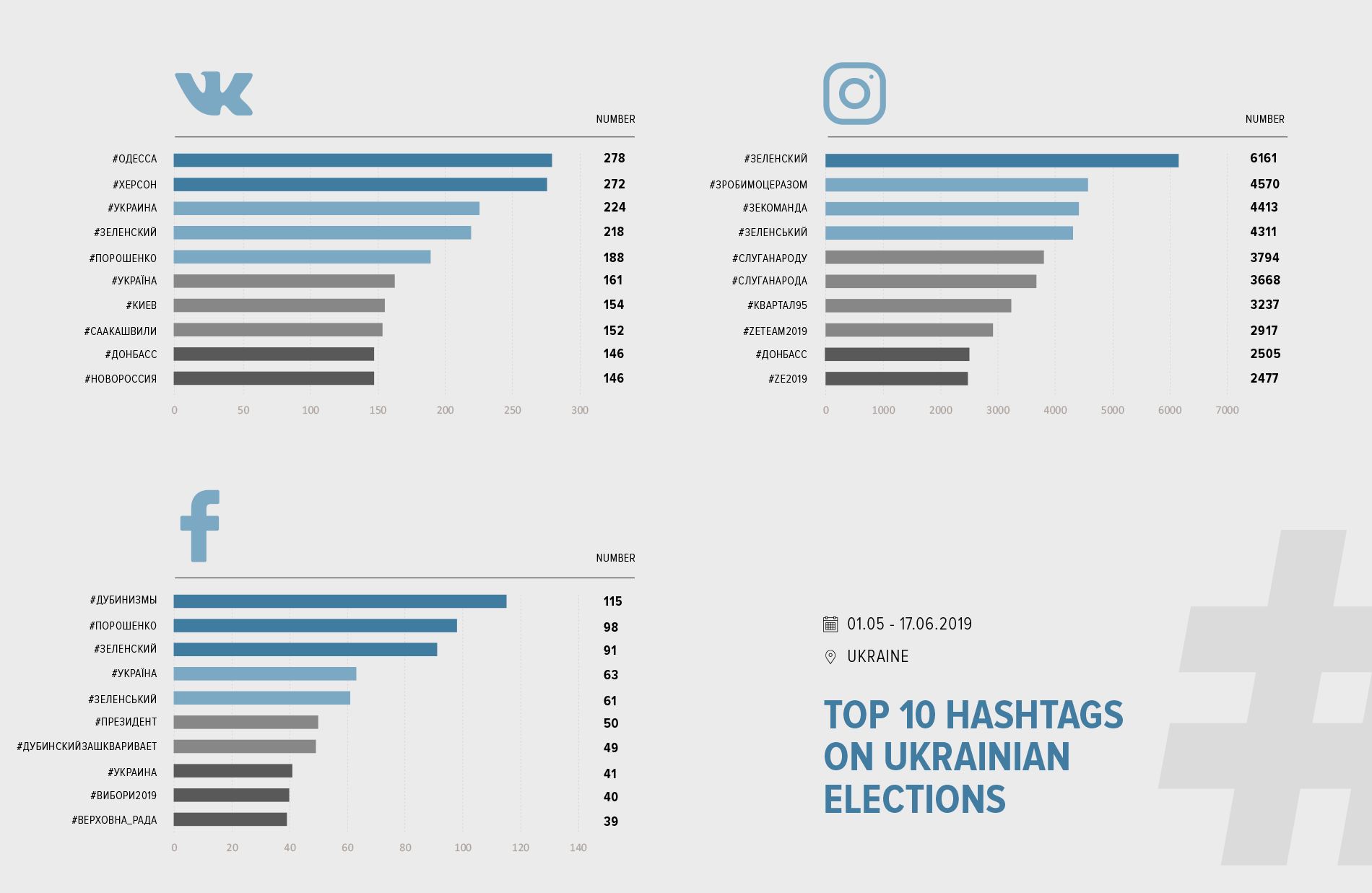 All three social networks have responded actively to political events in Ukraine. In VK, Facebook and Instagram the number of posts devoted to the election sharply increased immediately during Zelensky’s inauguration ceremony on May 20. Compared to early May, on inauguration day itself, the number of posts on VK and Facebook has almost tripled, while the number on Instagram increased sevenfold. While the dynamics of Instagram and VK subsequently declined, Facebook users continued to be active regarding election-related topics. On average, there were about twice as many posts on Facebook than before the inauguration (approximately 1,200 posts). VK only got a quarter more posts instead (250 posts on average).