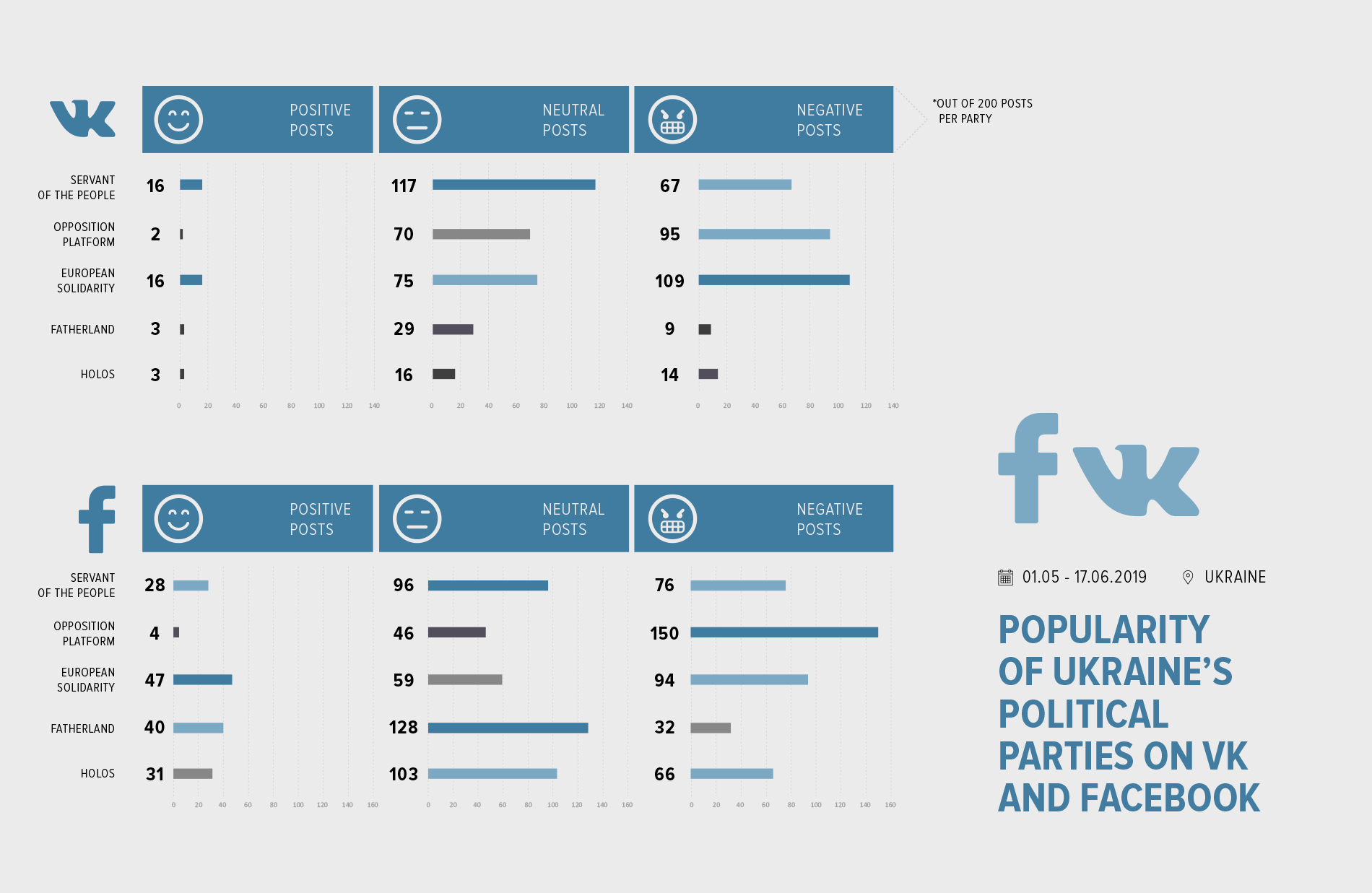 On those social networks where people express and discuss opinions, namely Facebook and VK, negative rhetoric with regard to Ukrainian politicians prevails. In VK, a Russian social network, any Ukrainian political force that is an advocate of a sovereign and democratic Ukraine is usually despised and mocked. Therefore, negative messages about all Ukrainian parties outnumber the positive ones and sometimes even neutral ones. On Facebook, the situation is not as bad. Nevertheless, the negative rhetoric still prevails over positive rhetoric with regard to all parties, except for Tymoshenko’s Fatherland. Negative rhetoric dominates in 42% of the Facebook-posts analyzed, while positive rhetoric is found in just 15% of the posts analyzed. European Solidarity and Opposition Platform are the only parties on Facebook which have a prevalent number of negative posts not only over positive ones but also over neutral ones.