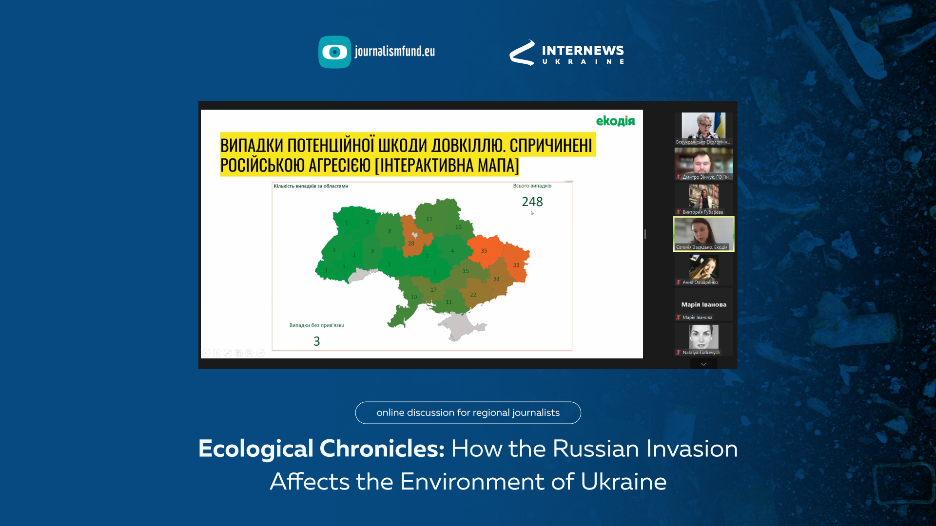 The participants of the online discussion took part in the small grants program for the media with the support of the Journalism Fund. As a result, 16 journalists prepared and published 48 various materials concerning the war's impact on Ukraine's environment.