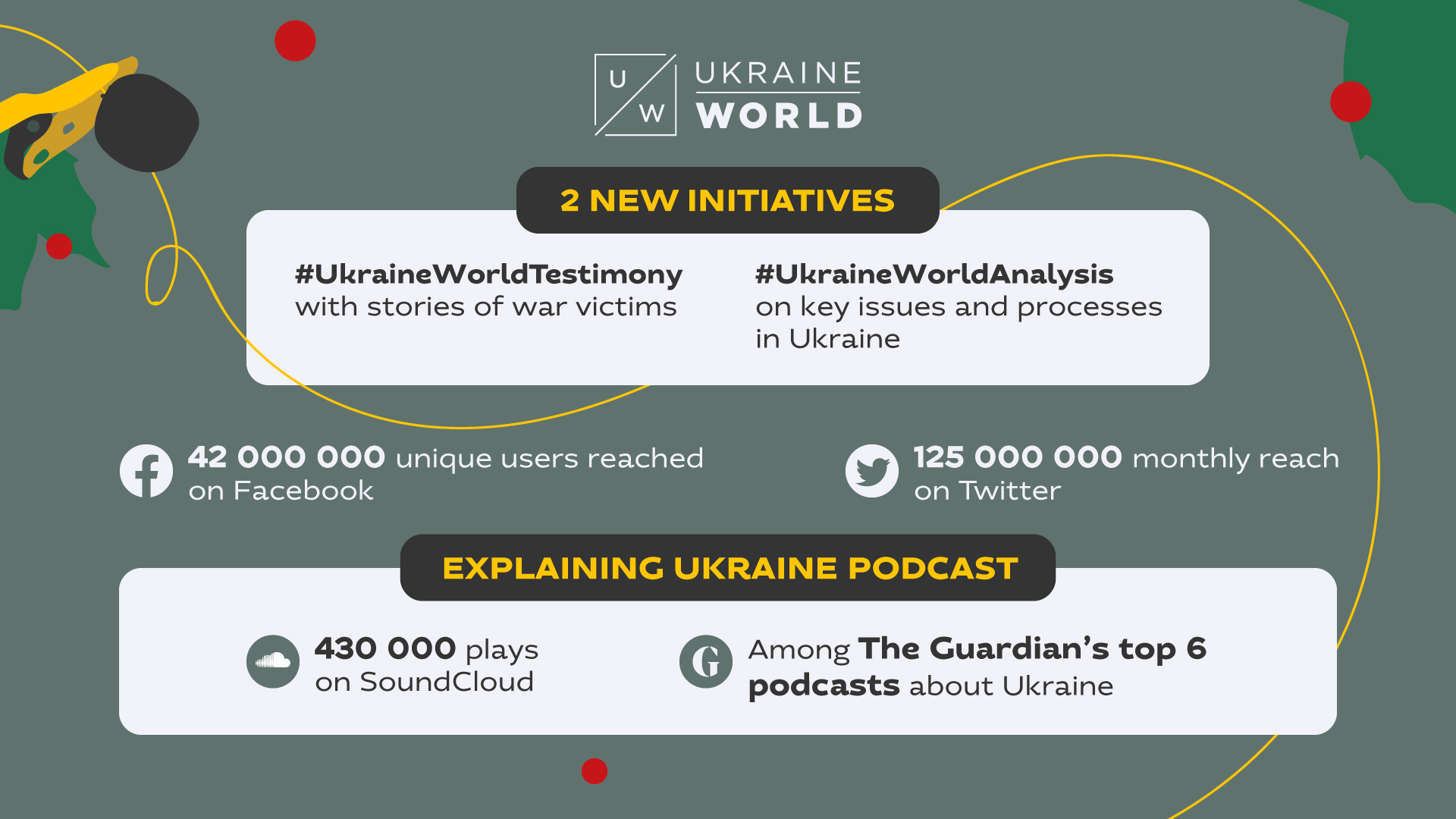 Along with podcasts from The New York Times and Sky News, the Explaining Ukraine podcast was named among the top 6 English-language podcasts about Ukraine by The Guardian. It has been listened to 430,000 times on SoundCloud.