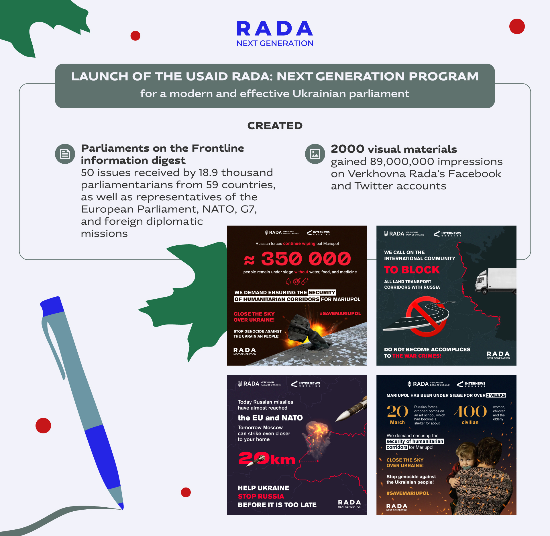 Our team created 2,000 visual materials that were published on the Verkhovna Rada's social media pages. They included quotes from Ukrainian and foreign politicians and cultural figures, infographics about Russian war crimes in Ukraine, and other relevant data. This communications support helped to reach more than 16 million users on Facebook and gain 73 million impressions on Twitter.