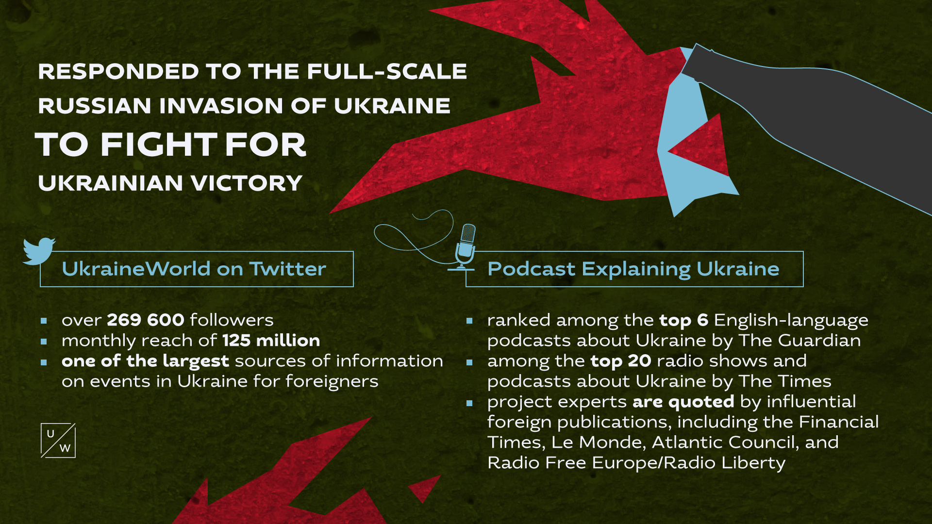 UkraineWorld's Expaining Ukraine podcast was ranked among the top 6 English-language podcasts about Ukraine by The Guardian, and among the top 20 radio shows and podcasts about Ukraine by The Times. The project’s experts are quoted by influential foreign publications, including the Financial Times, Le Monde, Atlantic Council, Radio Free Europe/Radio Liberty.