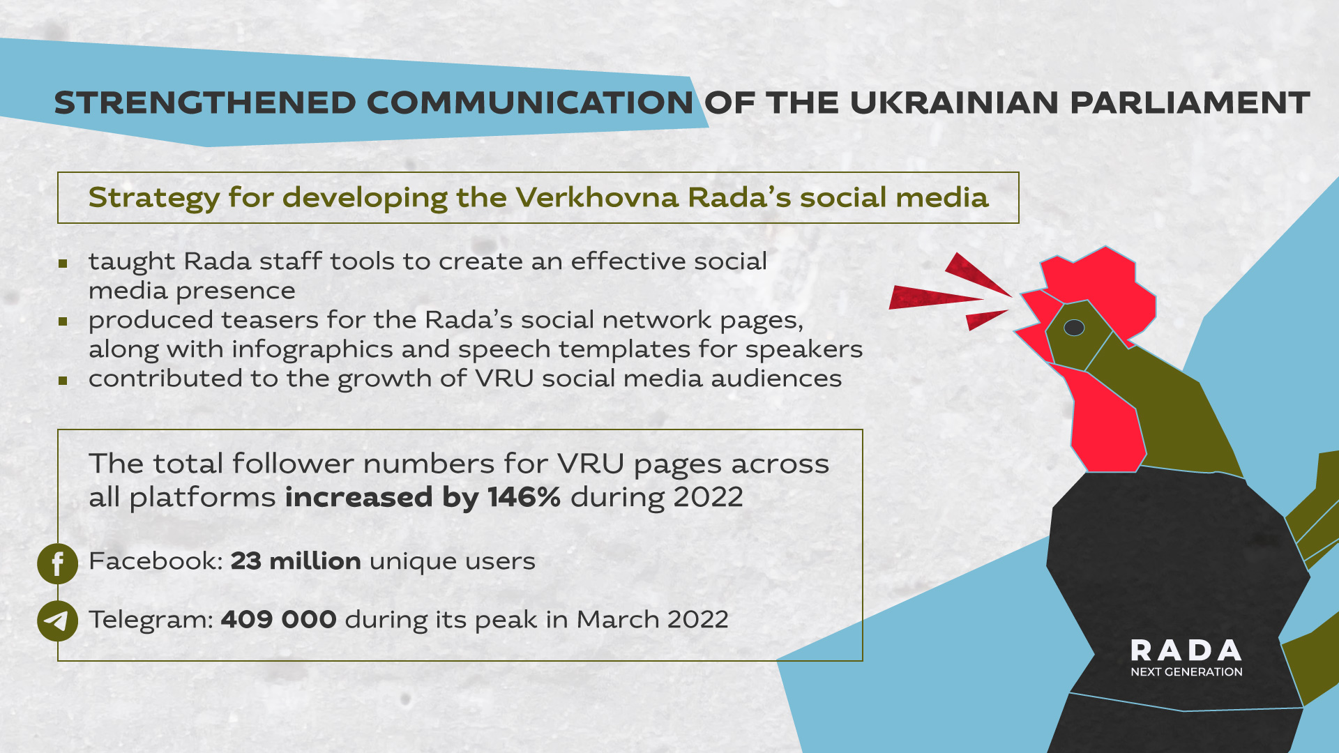 We also developed a 12-month strategy for developing the Verkovna Rada’s social media presence (2022—2023). Throughout the year, we conducted workshops for Rada staff, where we taught them various tools to create an effective social media presence. In addition, we provided communication support to the Parliament, including producing teasers for the Rada’s social network pages, along with infographics and speech templates for speakers. All these efforts contributed to the Verkhovna Rada’s emergence on social media at a qualitatively new level, as evidenced by the significant growth in its pages’ followings and the reach of their posts. In 2022, the total number of followers of the VRU pages across all platforms (Facebook, Twitter, Telegram, and Instagram) during 2022 increased by 146% over the previous year.