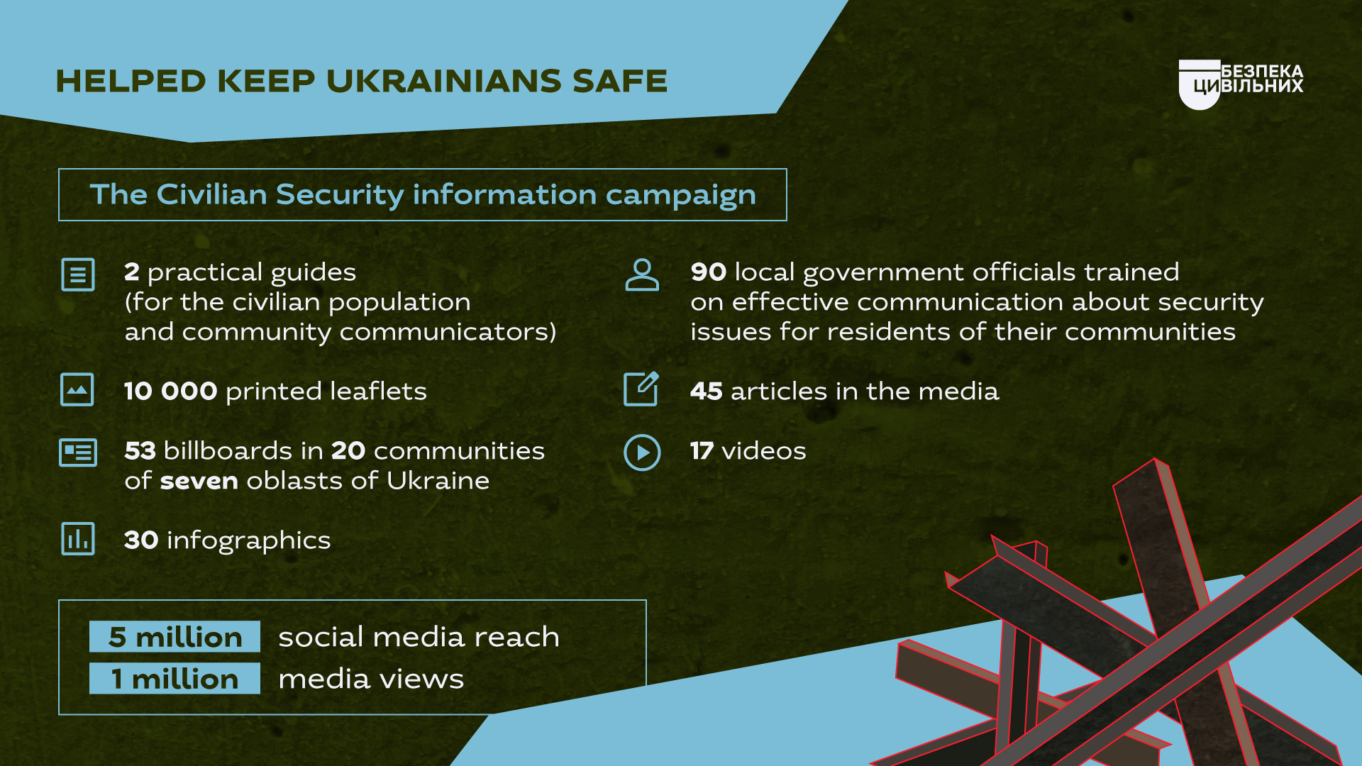 In 20 communities in seven oblasts of Ukraine (Volyn, Zhytomyr, Zakarpattya, Lviv, Odesa, Poltava, and Rivne), we installed billboards to remind Ukrainians of basic rules of civil security. In addition to outdoor advertising, we also conducted the campaign online, achieving a total reach with our videos and infographics of 5 million. Other communication products from the campaign included 45 articles in the media, 10,000 printed leaflets, and two practical guides (for civilians and community communicators). In addition, almost 100 members of local government received training on effective communication about security issues for residents of their communities.