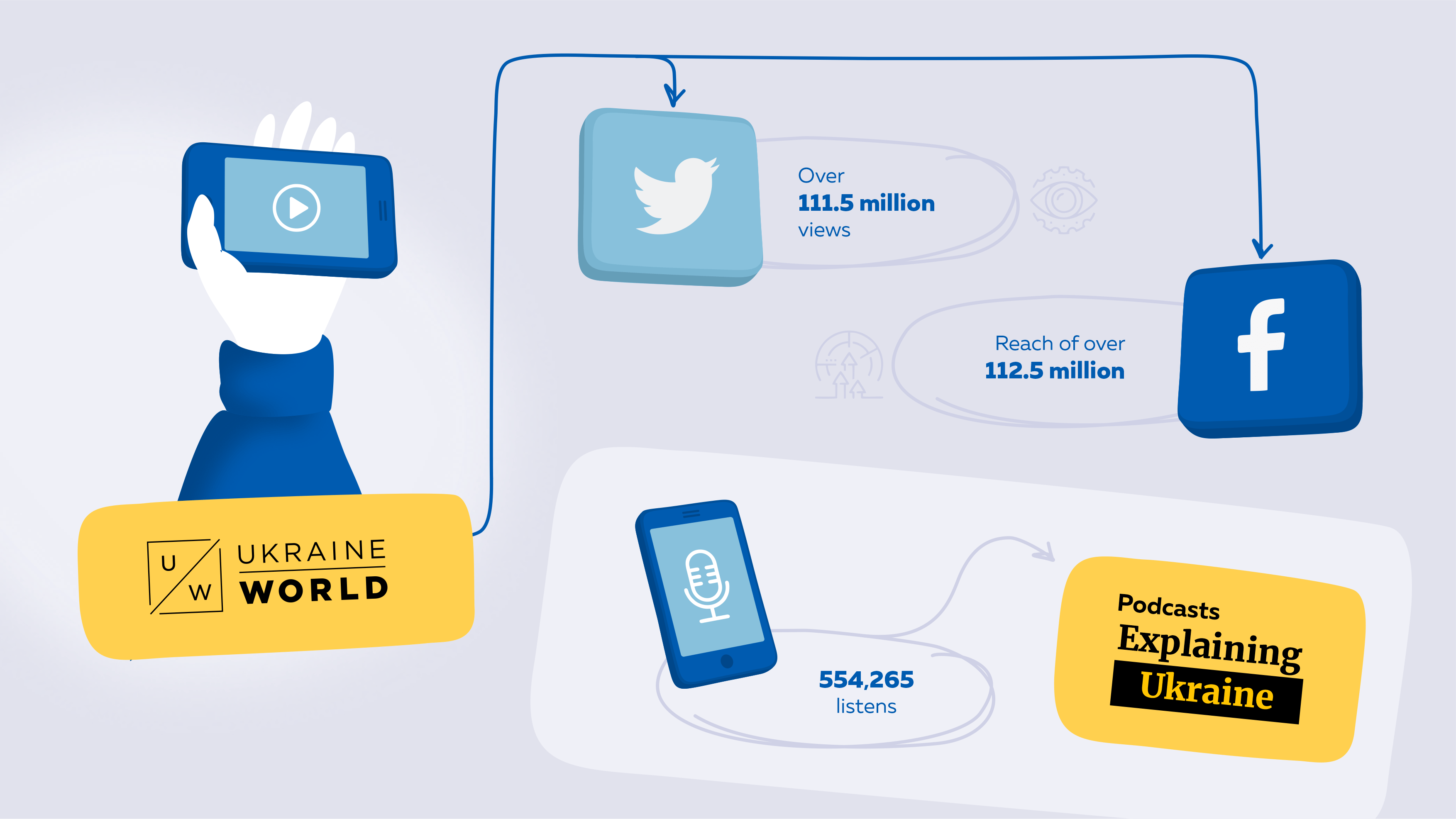 In the first 6 months of 2023, the UkraineWorld Twitter account received more than 111.5 million views. During the same period, the Facebook page reached more than 12.5 million views. UkraineWorld's Explaining Ukraine podcast also reached a substantial foreign audience with 554,265 listens.
