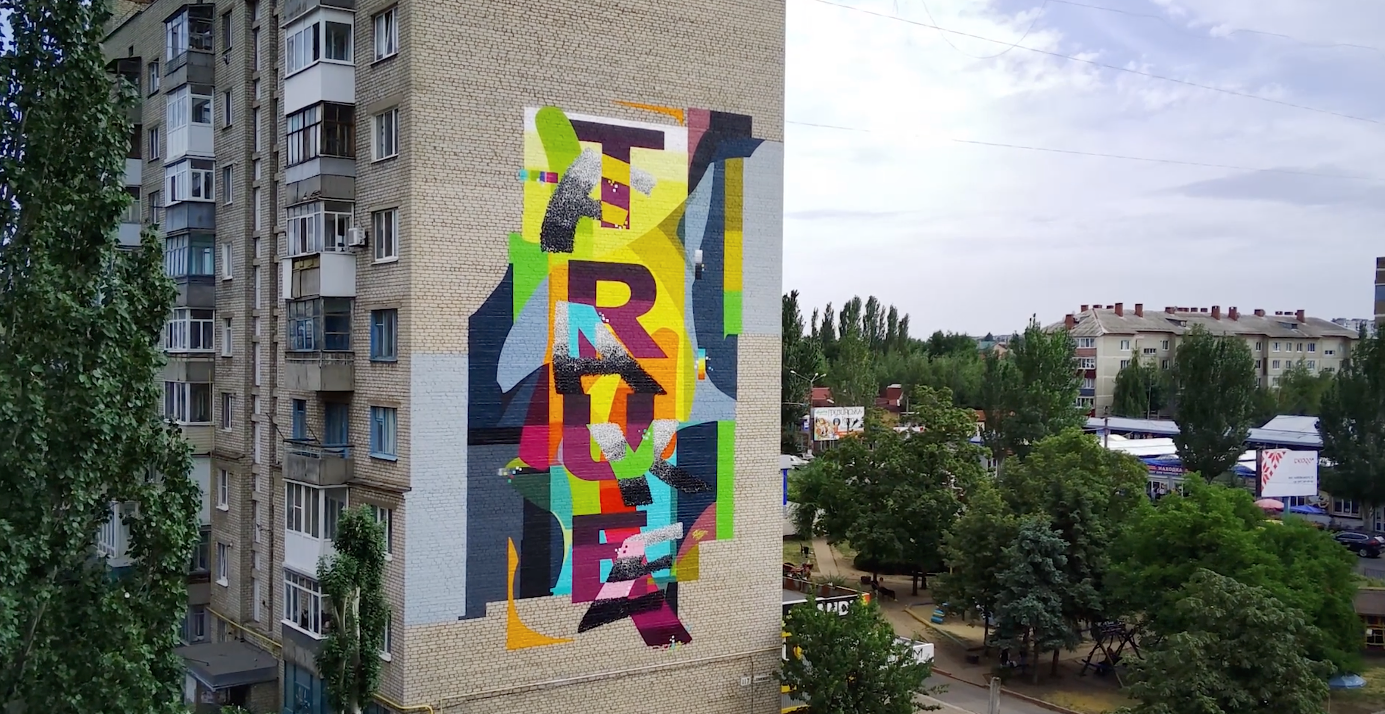 Мурал «Поміж літерами», 2021 рік. Автор: Ян Птушко, Україна. Основні елементи роботи: слово TRUE — у перекладі з англійської «правдивий», «справжній»; слово FAKE — у перекладі з англійської «підроблений», «сфабрикований». На муралі слово FAKE ніби ховається за словом TRUE, зливаючись з ним. Так само і в житті: щоб побачити фейк, треба читати уважно й поміж рядків.