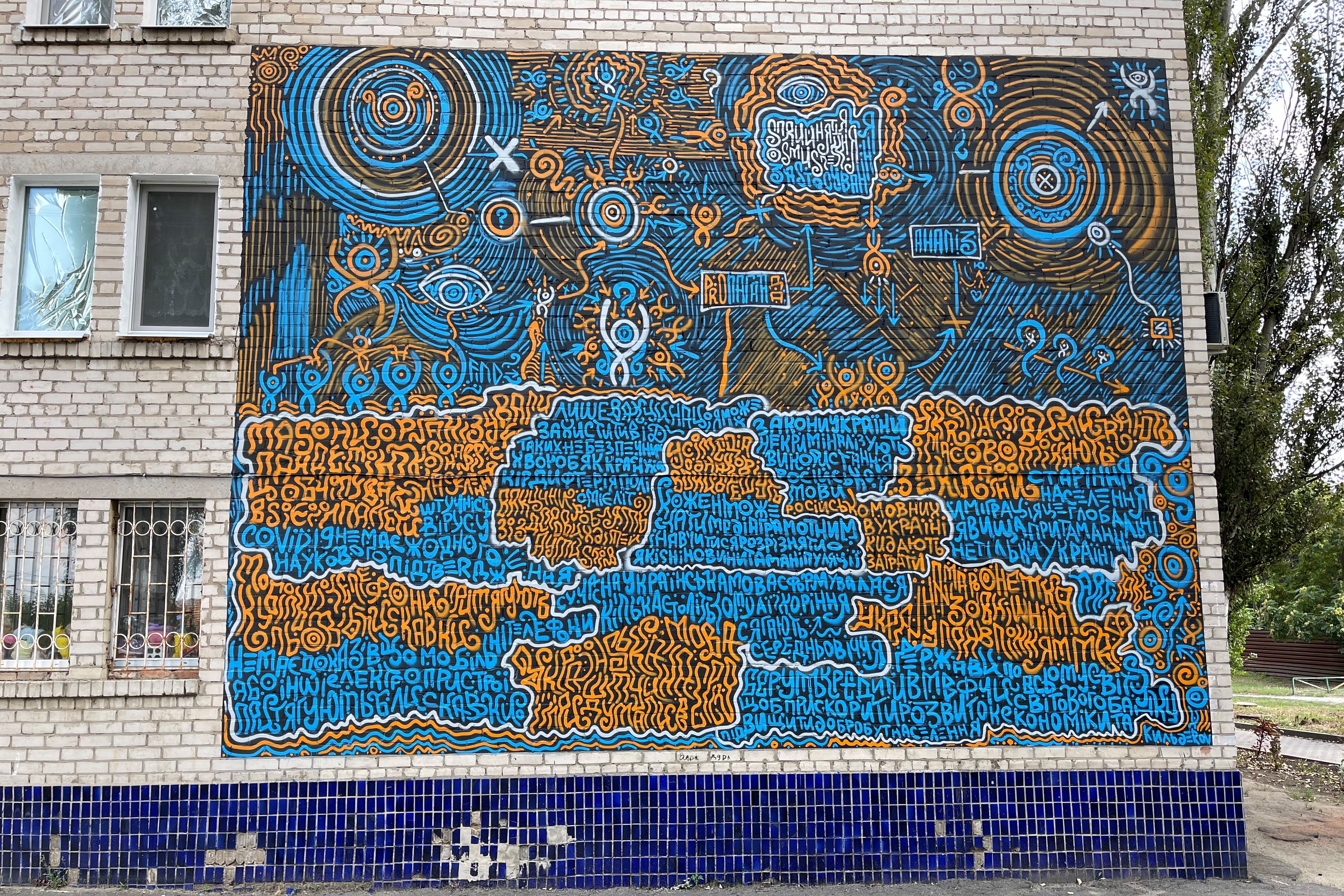 Мурал «ІнфоSHUM», 2021 рік. Автор: художник Максим Кільдеров (Україна). Основні елементи роботи: 1. Текст помаранчевого кольору — це фейкові новини, які поширюються в Україні через медіа та соціальні мережі. 2. Текст блакитного кольору — це спростування цих фейків на основі інформації та фактів з офіційних джерел.