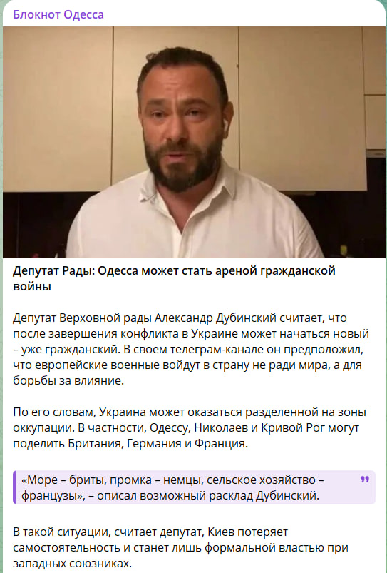 З іншого боку, у проросійських Telegram-каналах Одещини та Миколаївщини поширювали наративи про захоплення Одеси, Миколаєва і Кривого Рогу іноземними військами у межах «поділу України». У цьому регіоні також поширювали повідомлення нібито про плани віддати Одесу французькому військовому контингенту. Аналогічно, як і з попереднім кейсом, жодних доказів існування таких планів немає. Комі того, фейки про відправлення французьких військ до України були спростовані Центром протидії дезінформації ще у травні 2024 року.